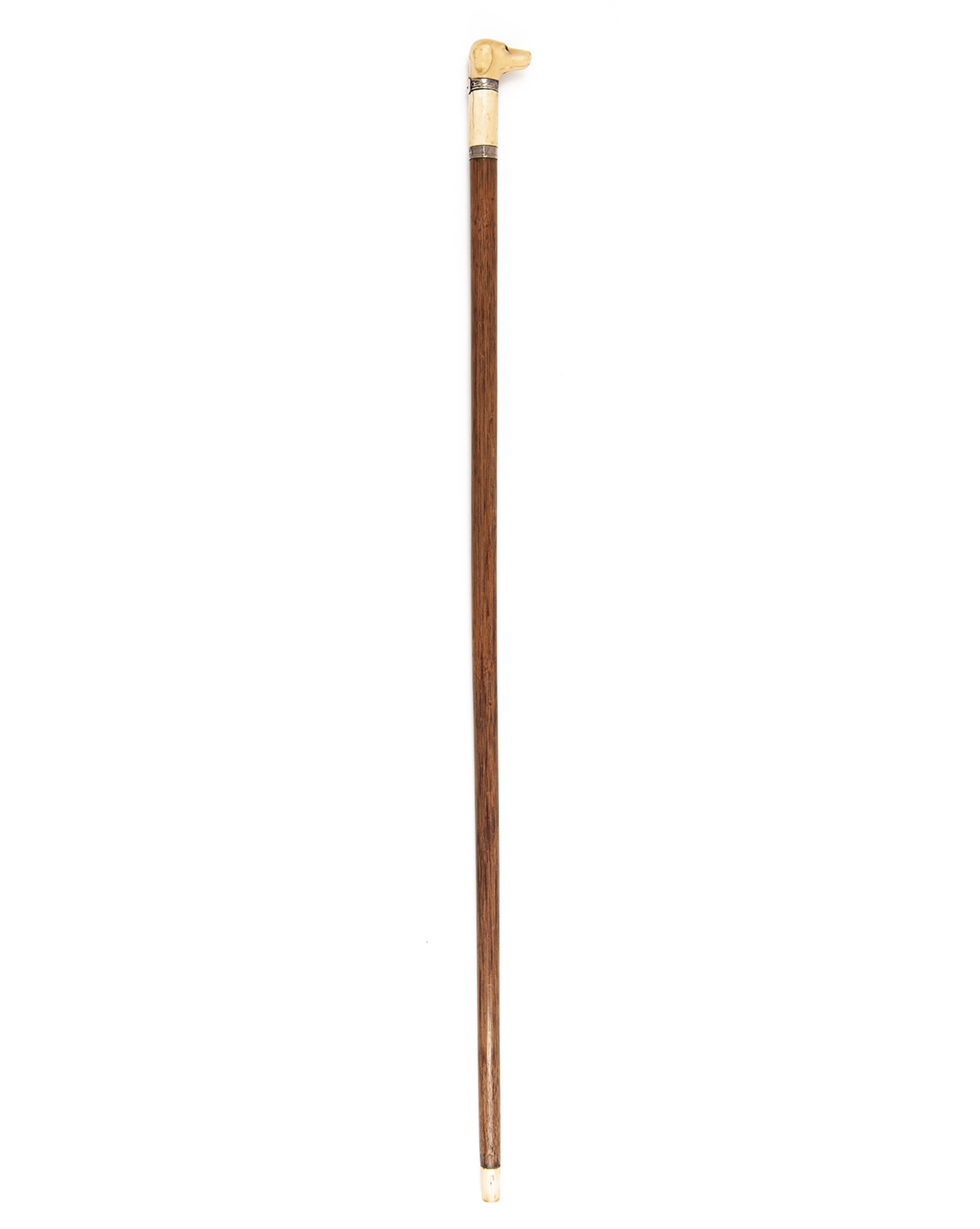 Birmingham hallmarks (rubbed, possibly 1900), with plain cane shaft tipped with an ivory ferrule, the pommel carved with a realistic depiction of a hound's head, applied glass eyes and sporting a realistically carved and moulded silver collar with a further hallmarked silver band at the join