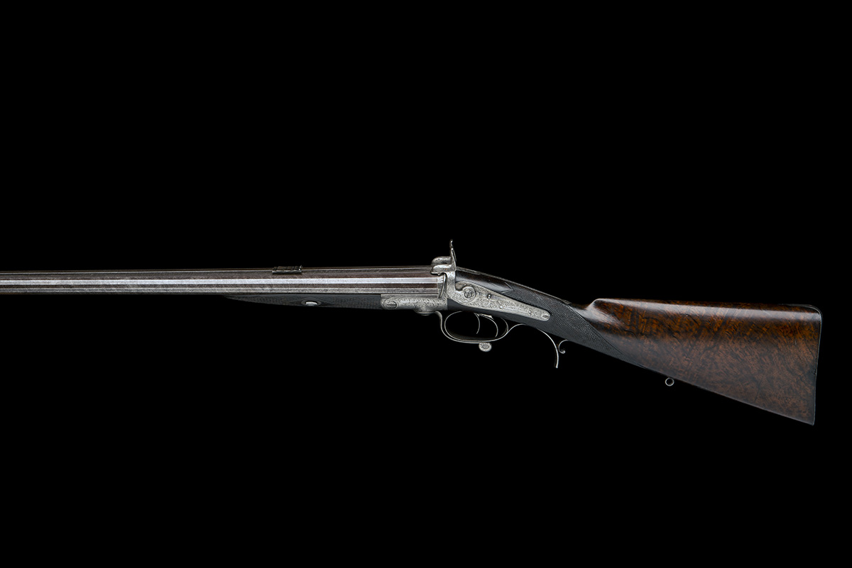 circa 1860, with unusual damascus polygonal 28in. side-by-side barrels, raised flat top-rib matted for the last 5in. and signed 'SAML. & C. SMITH PRINCES STREET LEICESTER SQUARE, LONDON', dove-tailed bead fore-sight, rear-sight with shallow standing notch and three flush-folding leaves, border and scroll engraving at breech, narrow faceted standing breech with shallow carved percussion fences, borderline and scroll engraved elongated top-tang and shallow sighting groove, borderline and scroll engraved back-action locks with sliding safes behind the dolphin headed engraved hammers and signed 'SAML. & C. SMITH PRINCES ST. LONDON', figured walnut butt-stock chequered at the wrist, engraved iron furniture including finely chequered pistol-grip spur to the lower tang, single bite swing-lever opening, fully chequered walnut splinter fore-end with cross-key fixing and fitted with eyelets for sling, complete with a period leather storage case possibly associated and lined in burgundy baize, replacement trade label to inside of lid