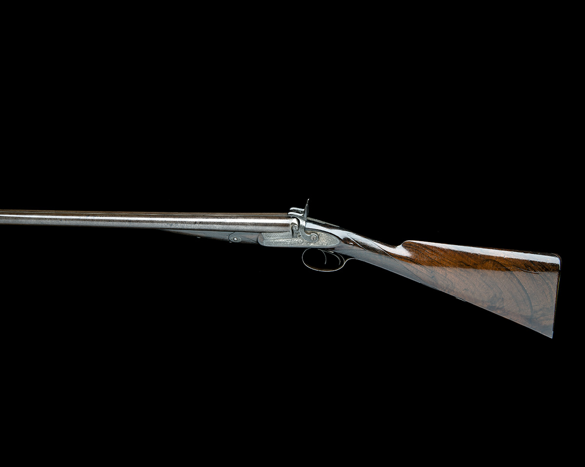 30in. damascus barrels, rib engraved 'J. & G.H. NEEDHAM'S. PATENT. 26. PICCADILLY. LONDON.' and '1', starburst engraving at the pinfire apertures, action incorporating Needham patent rotating single bolt sidelever patent, patent no. 1544 of 1862, use number 1013, the fences with external cams half-cocking the hammers as the sidelever is pushed down, semi-serpentine fences and side bolsters, sidelocks with dolphin hammers, permanently attached fore-end, best border and fine acanthus scroll engraving, 14 1/4in. figured stock including steel buttplate, weight 6lb. 10oz.
