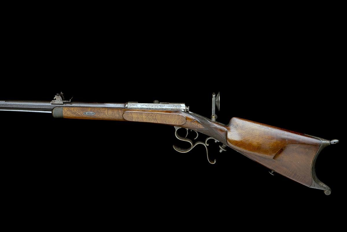 circa 1885, with blued octagonal 31 1/2in. barrel, the top-flat dove-tailed for an adjustable position rear-sight and signed 'V. CHR. SCHILLING IN SUHL', the side-flats marked 'GUSS' and 'STAHL' respectively, dove-tailed fore-sight blade with curved side-protectors, carved elevating tangent rear-sight, octagonal form borderline and scroll engraved colour hardened receiver with short straight bolt handle, no provision for safe, borderline and scroll engraved top-tang mounted with a pan-headed aperture sight, walnut tyrolean half-stock with chequered wrist and Swiss heel-plate, complex trigger-guard with integral palm-rest, double-set triggers, plain fore-end with moulded horn schnabel tip and iron under-barrel clearing-rod, much original finish remaining