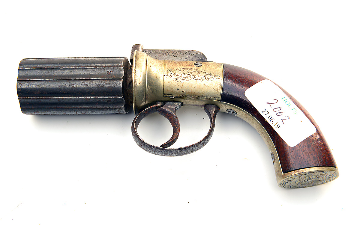 A 100-BORE PERCUSSION PEPPERBOX REVOLVER, UNSIGNED, no visible serial number,