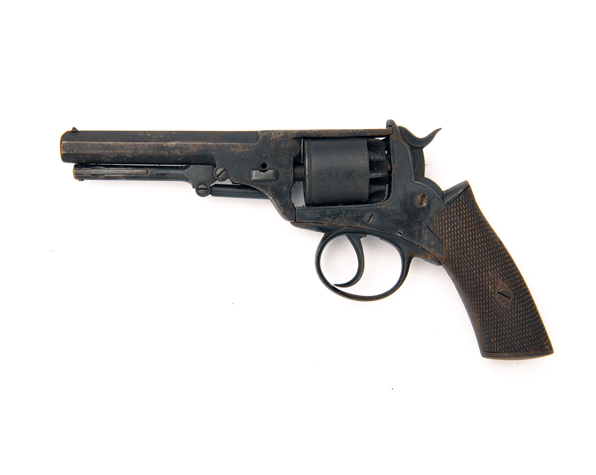 AN 80-BORE PERCUSSION POCKET-REVOLVER, UNSIGNED, MODEL 'WEBLEY WEDGE-FRAME TYPE', serial no. 4526, circa 1853, with octagonal 4 3/8in. barrel, articulated rammer, barrel secured via a wedge, plain cylinder, double action mechanism and chequered walnut grip, refinished