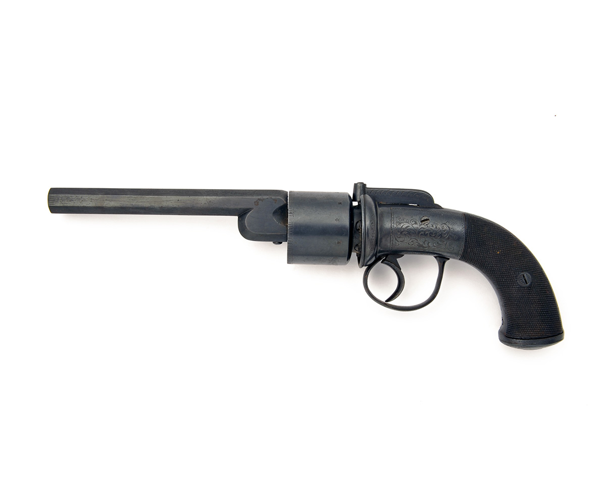 A 50-BORE PERCUSSION TRANSITIONAL REVOLVER, SIGNATURE OBSCURED, MODEL 'BAR-HAMMER', serial no. 228/68, English circa 1850, with multigroove rifled octagonal 5 5/8in. barrel (address rubbed out), plain cylinder, scroll engraved rounded action with guarded trigger and finely chequered walnut grips with trap to pommel