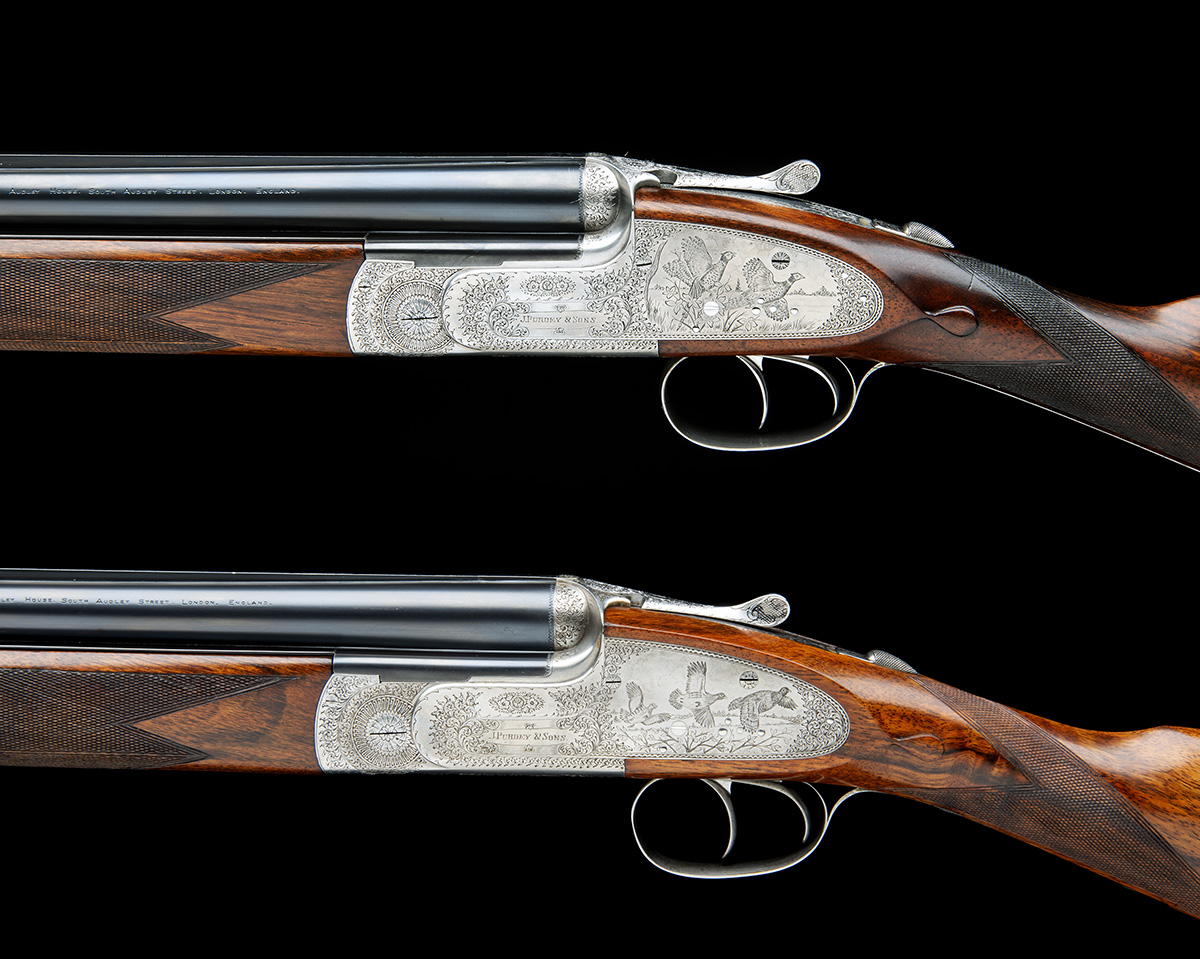 28in. nitro chopperlump barrels with 6mm solid matt top-ribs engraved '1' and '2' at the breech ends, the top tubes engraved 'J. PURDEY & SONS. AUDLEY HOUSE. SOUTH AUDLEY STREET. LONDON. ENGLAND.', 2 3/4in. chambers, bored approx. imp. cyl. in all, hold-open toplevers inlaid '1' and '2', automatic safeties with gold-inlaid 'SAFE' details, cocking-indicators, engraved with bouquet and acanthus scrollwork, No.1 lockplates engraved with scenes of flushed fowl and partridge, No.2 with scenes of pheasant and partridge flushed from their naturalistic habitat, signed 'D. O'Brien', the undersides with engraved vignettes of hounds surrounded by acanthus scrollwork and engraved with the makers name and details, brushed finish, 14 3/8in. figured stocks including 7/8in. leather-covered recoil pads, weight 7lb. 11oz (No.1) 7lb. 8oz. (No.2), in their makers brass-cornered burgundy leather double guncase with some accessories