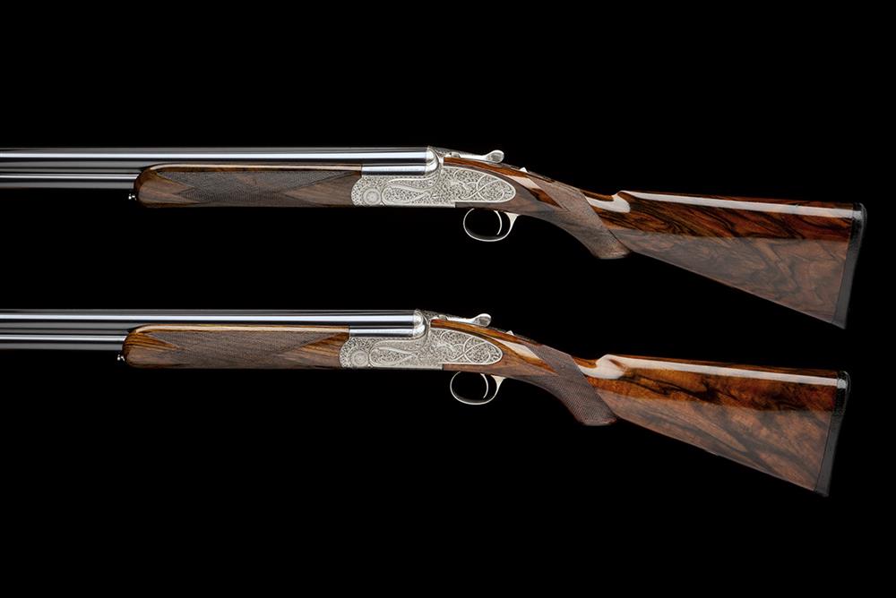28in. nitro chopperlump barrels with 9mm solid raised file cut top-ribs, 2 3/4in. chambers, multichokes (no spares), hold-open toplevers, automatic safeties with integral barrel selector switches, toplevers gold-inlaid '1' and '2', bolstered actions fully engraved with bold acanthus and ribbonwork, the makers name in scrolling banners and the underside with the model designation in roundels, bright finish overall, 14 1/4in. boldly-figured semi-pistolgrip stocks with pistolgrip-caps and including 1/2in. leather covered recoil pads, No.1 fore-end wood with minor cracks to the left side at the knuckle, weight 7lb. 13oz., in a universal motor case