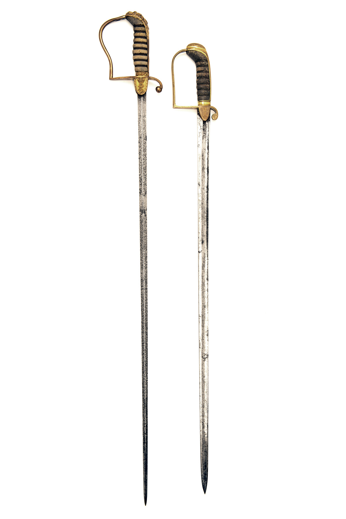 late 18th to early 19th century, the first with straight slightly shortened 26in. narrow blade, broad fuller for its full length and possibly signed for 'SALTER, No.13 Strand' at hilt, stirrup guard with two shield-shaped langets engraved with fouled anchors and fitted with a wire bound sharkskin grip and brass backstrap and pommel, the second with 28in. blade of flat diamond cross-section, similar hilt but with moulded and carved langets, wire bound sharkskin hilt and carved lionshead pommel, both with strong traces of gilt and both missing scabbards