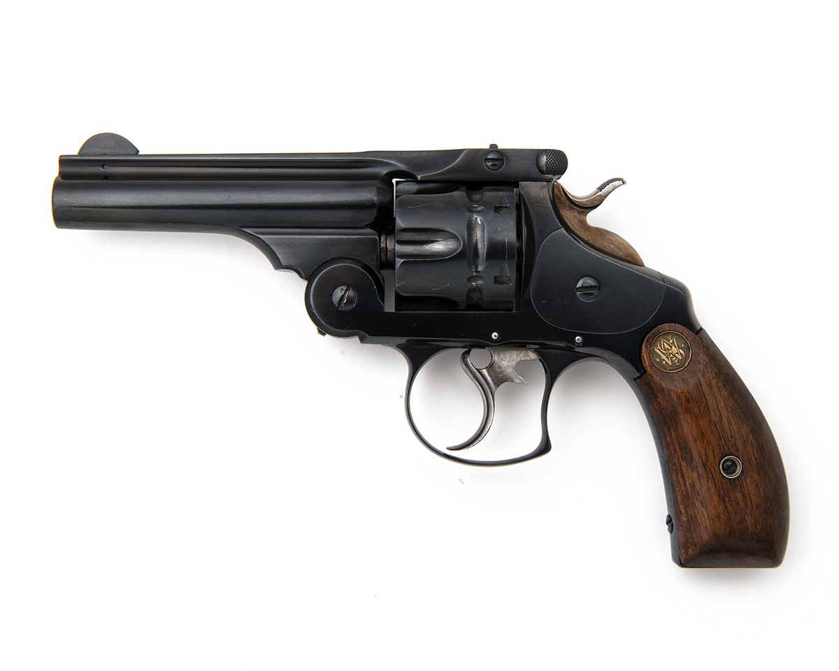 circa 1894, with 4in. barrel signed on the raised sighting rib by the manufacturer and with patent dates to 1880, break-open frame with fluted cylinder, distinctive double locking notches, straw-coloured hammer, burnished trigger, smooth walnut grips inlet with 'S&W' monogrammed medallions and square-backed trigger-guard, the whole professionally refinished and in a later wood case lined in the continental fashion in green baize and complete with a cleaning rod and oil bottle