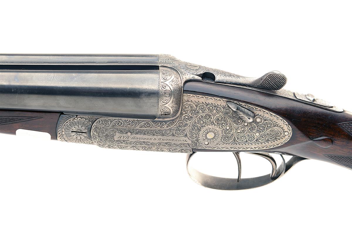 AYA 12-BORE 'MODEL NO.2' HAND-DETACHABLE SIDELOCK EJECTOR, serial no. 201088, 26in. nitro chopperlump barrels (dents and pits), 2 3/4in. chambers, bored approx. imp. cyl. and 1/2 choke, removable striker discs, automatic safety with gold-inlaid 'S' detail, hand detachable lockplates, gold-inlaid cocking indicators, rolled-edge triggerguard, border and acanthus scroll engraving, 14in. stock including buttplate, weight 6lb. 9oz.