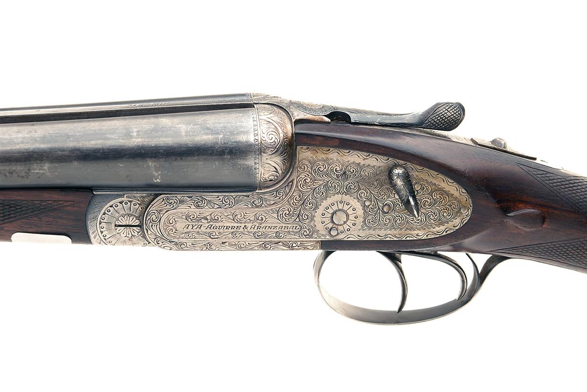 AYA 12-BORE 'MODEL NO.2' HAND-DETACHABLE SIDELOCK EJECTOR, serial no. 382685, 27 1/4in. nitro barrels (dented), 2 3/4in. chambers, bored approx. imp. cyl. in both, removable striker discs, automatic safety with gold-inlaid 'S' detail, hand detachable lockplates, gold-inlaid cocking indicators, articulated front trigger, rolled-edge triggerguard, 14 1/2in. stock, weight 6lb. 12oz.