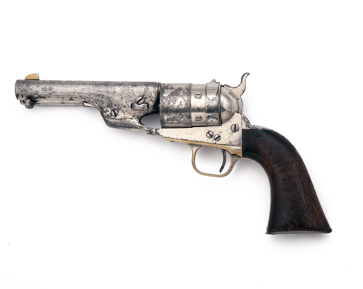 for between 1873-78, with probable factory shortened 4 3/4in. barrel signed 'ADDRESS COL. SAML. COLT NEW YORK U.S. AMERICA' (rubbed), plain open iron frame marked 'COLTS PATENT' (faint), plain cylinder with traces of naval scene, plated brass grip-straps, the side of trigger guard marked '44 CAL' (faint), smooth one-piece walnut grip and side-mounted ejector, all matching numbers, strong traces of nickel plate with some frosting elsewhere