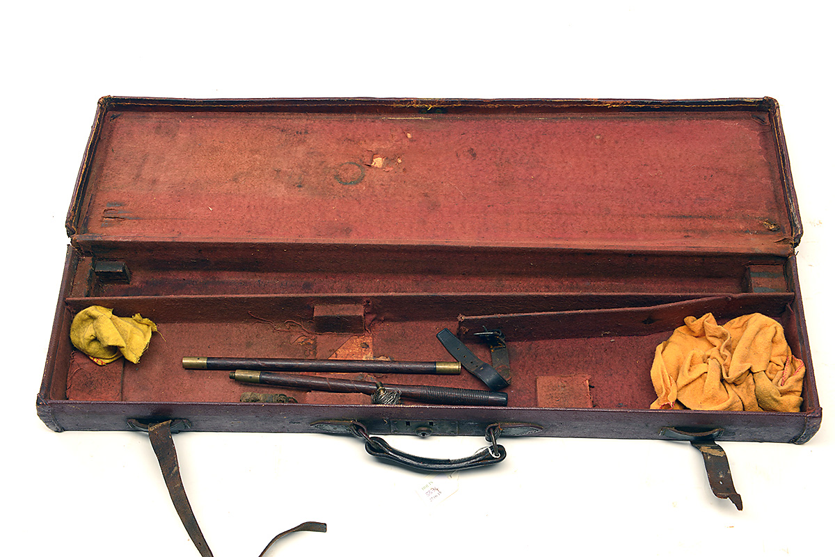 A CANVAS AND LEATHER SINGLE GUNCASE, fitted for 30in. side by side barrels, the interior lined with pink baize, brass lock (key missing), needs attention