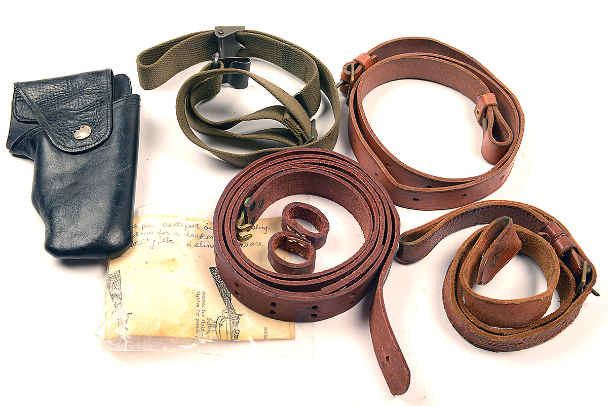 A COLLECTION OF EIGHT LEATHER RIFLE SLINGS, together with a leather pistol holster