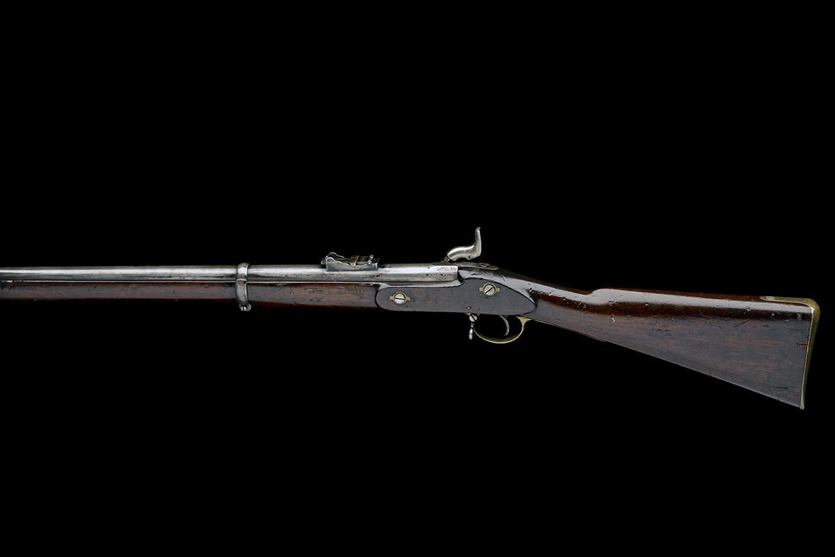 fully provenanced from the 1862 rifle trials, with 39in. oval-bored barrel signed 'LANCASTER'S PATENT' at breech and '151 NEW BOND ST'T LONDON' forwards of the rear-sight, block and blade fore-sight, 800 yard lader rear-sight, London proofs as a '25-bore' at breech, solid top-tang, borderline engraved bar-action lock and hammer, the bar signed 'C. LANCASTER', walnut three-quarter stock of Pattern '53 type with brass furniture, the heel-plate numbered '4' on the spur and with a Pattern Room inventory number painted to the toe, three iron barrel-bands and iron jag-ended ramrod, strong traces of finish throughout and together with an extensive file of research on the rifle together with a copy of the original receipt of purchase from the Pattern Room dated 1983 and a copy of the entry for rifle number '5' from the Enfield Pattern Room catalogue