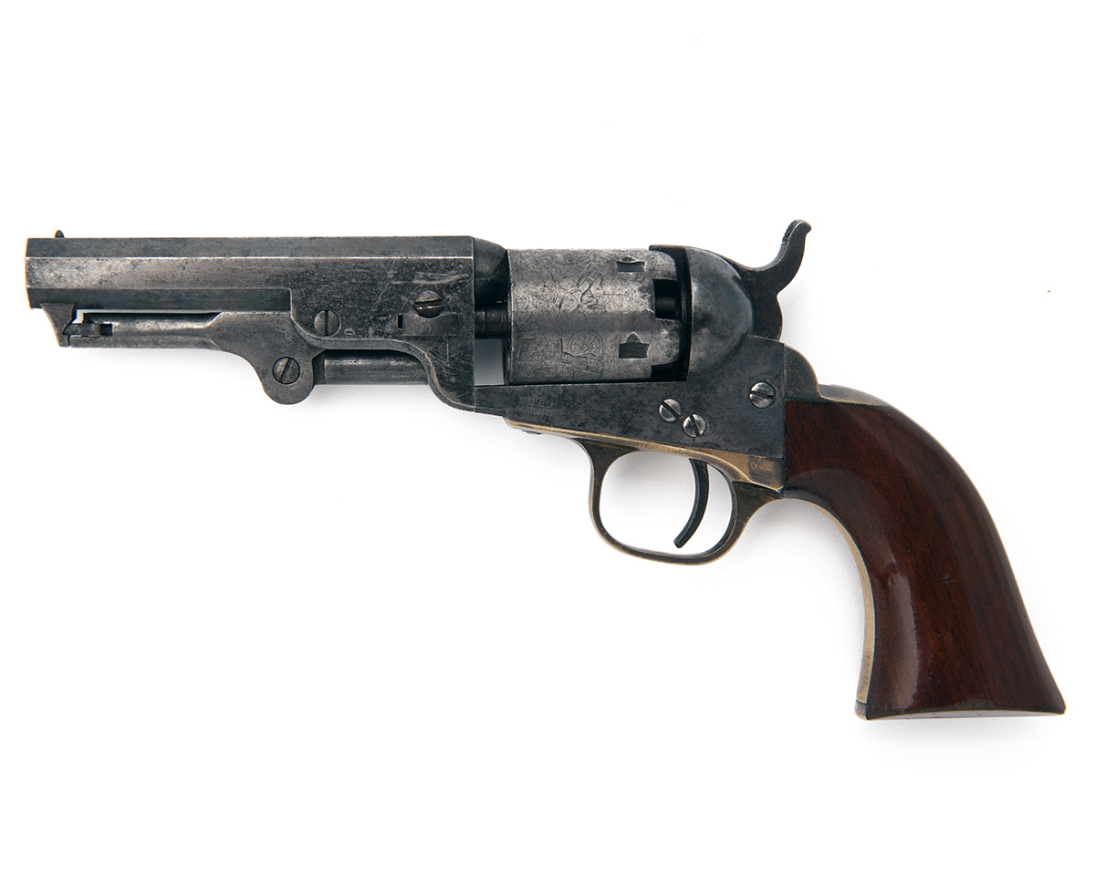 one of the last produced in 1873, with blued 4in. octagonal barrel (strong traces of finish), the top-flat signed 'ADDRESS COL SAML. COLT NEW-YORK US AMERICA', plain cylinder with roll engraved scene, open iron frame marked 'COLT'S PATENT', brass grip-straps and trigger guard bow with strong traces of silver plate, articulated under-barrel rammer and smooth walnut grips