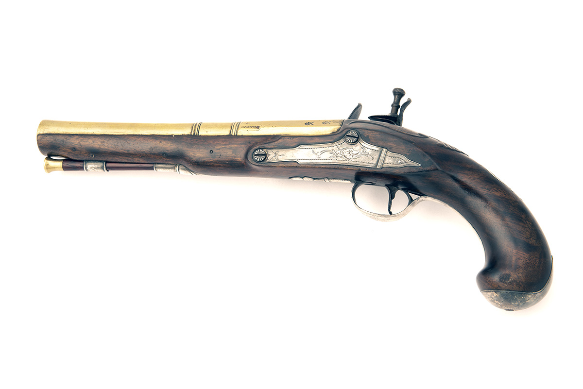 A GOOD 14-BORE FLINTLOCK BRASS-BARRELLED SILVER MOUNTED HOLSTER-PISTOL, no visible serial number,