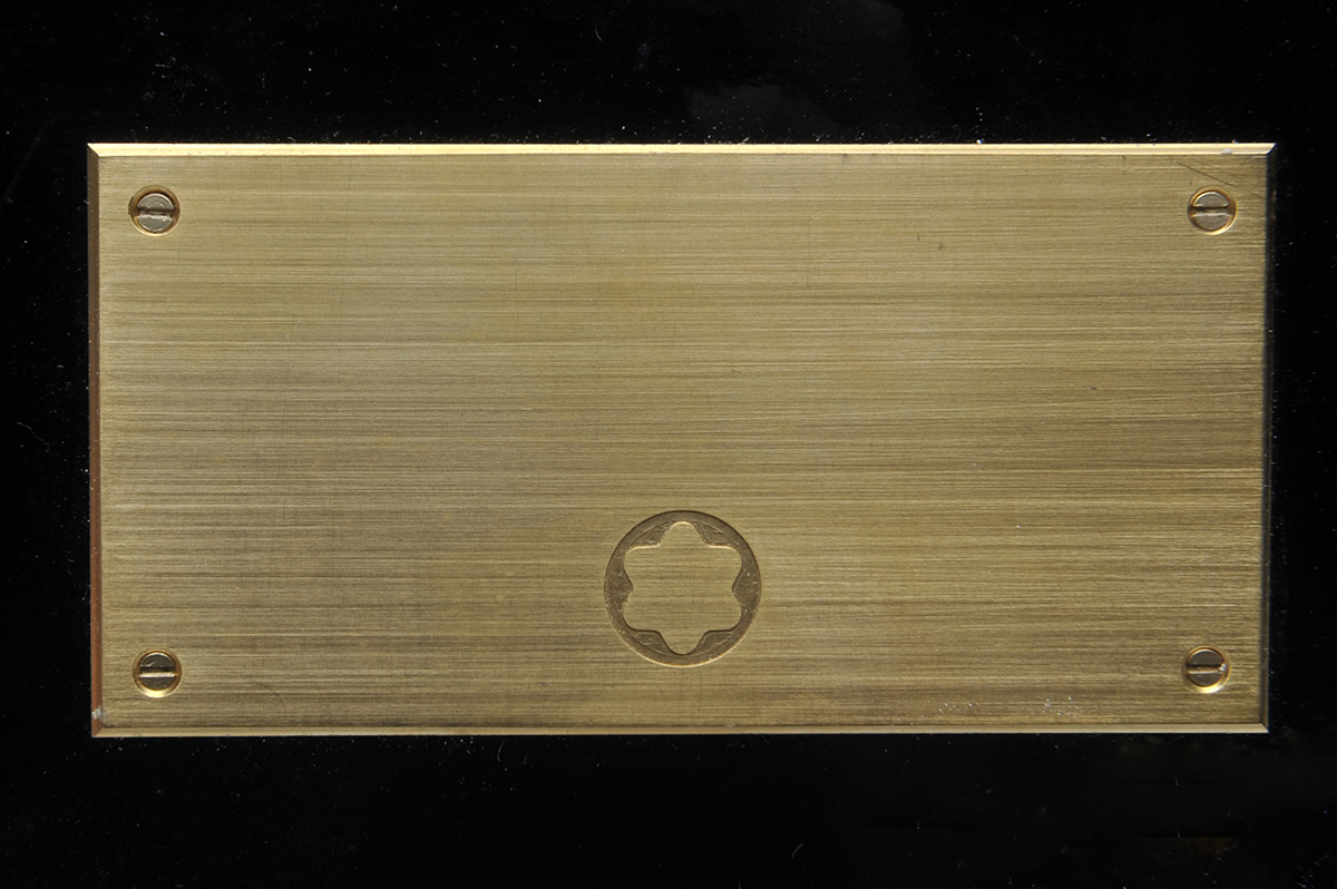 measuring externally 12in. x 8 1/4in. x 3 1/4in, the interior lined in cream suede for two layers of ten pens, the outer lid with vacant gilt plaque embossed with the Montblanc trademark and lock to front with key and outer card carton, some mild staining