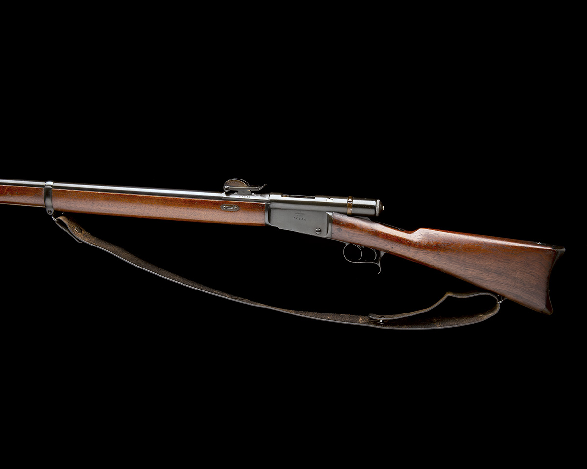 circa 1882, with blued 33 1/4in. barrel, block and blade fore-sight, elevating tangent rear-sight, tubular bolt-action receiver, the bolt with turned down handle, side loading aperture, tubular underbarrel magazine, walnut butt-stock and full-length fore-end concealing the magazine tube, blued furniture, double set triggers, complete with a period sling and a jag-ended clearing rod, the whole expertly restored