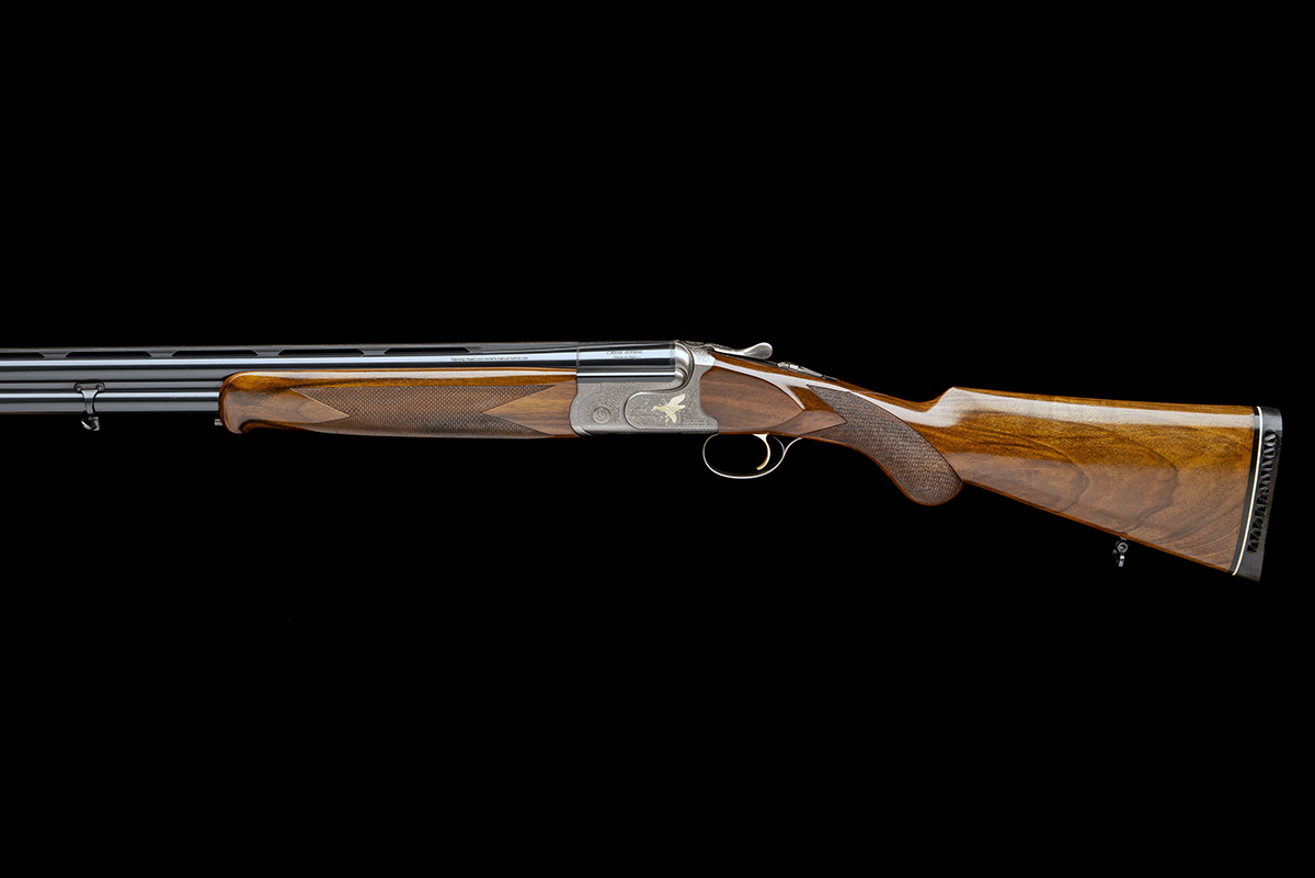28in. nitro barrels with 7mm ventilated matt top-rib, 3in. chambers, multichokes (with spares), hold-open toplever, manual safety with integral barrel selector switch, gold-washed single trigger, floral scroll engraving surrounding gold-highlighted game scenes, 14in. semi-pistolgrip stock including 3/4in. ventilated rubber recoil pad, weight 7lb. 3oz., in its makers universal case