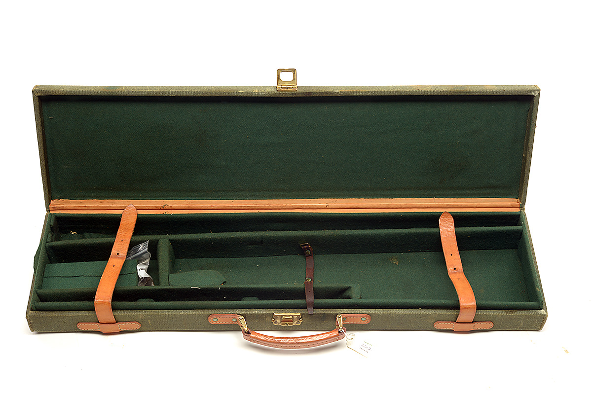 A GREEN CANVAS AND LEATHER SINGLE GUNCASE, fitted for 30in. barrels, the interior lined with green baizer
