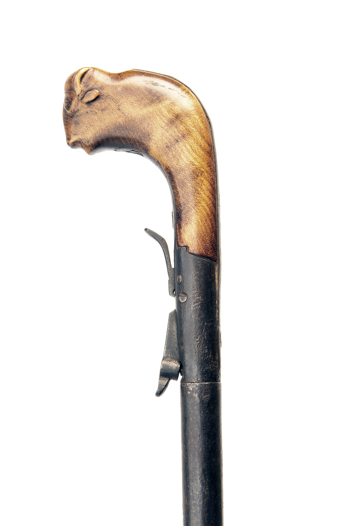 circa 1845, with turn-off 28 3/4in. plain iron barrel (loose on threads), rounded action with exposed under-hammer and trigger, replacement walnut handle amateurly carved in the form of a cow's head and iron grip-straps