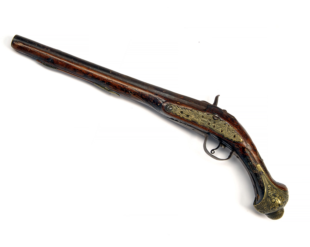 AN 18-BORE PERCUSSION HOLSTER-PISTOL, UNSIGNED, no visible serial number, Turkish circa 1790 and converted to percussion via drum and nipple, with 12in. barrel, heavily bevelled lock, moulded brass and iron furniture and walnut full-stock, poor condition with losses throughout