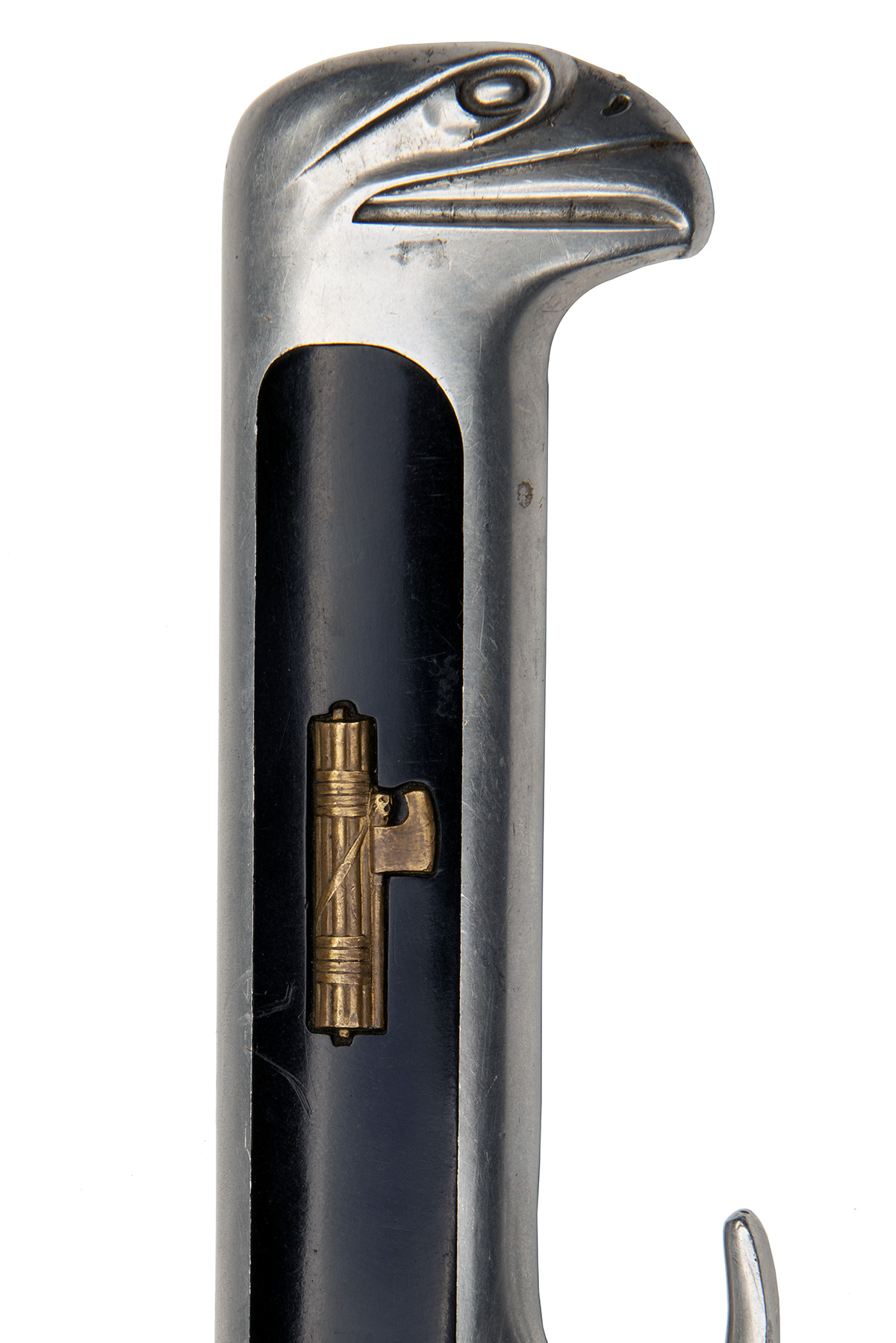 circa 1937, with plain plated 6 3/4in. blade false-edged for the last 4 3/4in., squared ricasso, moulded aluminium hilt with integral turned up single quillion and pommel carved as an eagle's head, the sides inlet with black resin panels, the left further inset with a facine device, the dagger retaining its chromed scabbard with swivel mounted bullion hanger