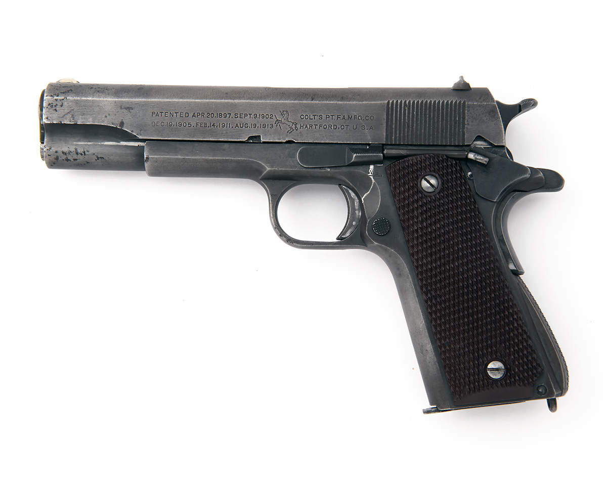 for 1942, with 5in. barrel, grey phosphated slide (faded, traces of two-tone finish at nose), makers details on the left hand side with patent dates to 1913, phosphated frame marked 'UNITED STATES PROPERTY', grip safe and chequered arched mainspring housing, chequered brown plastic grips, chequered trigger blade and replacement magazine