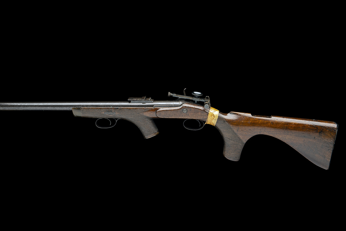 These most peculiar looking match-rifles were a joint patent between Alexander Henry and Daniel Fraser and were designed for conventional prone and back-position match shooting. They are equipped with a special Henry rifled progressive twist barrel with more lands and grooves than normal. When they started to appear at Wimbledon for competitions, the English immediately declared them an unfair advantage and banned them from competition use. Most of the guns made were subsequently sold to clients in both South Africa and Australia. Two versions were produced, a muzzle-loader as represented here and a falling block cartridge rifle. Only 24 pieces were produced across both models.
