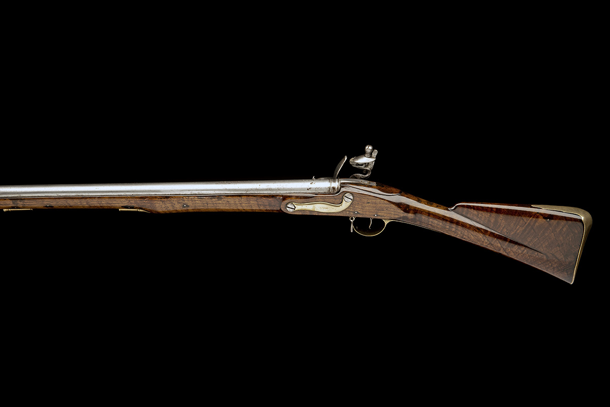 circa 1795, with brushed bright 39in. iron barrel, the top with the registration number for Co. Galway and also marked '90 REGT 2BN' (Cameronians, but possibly spurious), block fore-sight, moulded band at breech, solid top-tang, borderline engraved lock signed 'TOWER' at the tail and marked with a crown and 'G.R.' device below pan, walnut handrail stock with carved apron around the top-tang, brass furniture including heel-plate, 'L' shaped sideplate, trigger guard bow and ramrod pipes and fitted with an iron ramrod and stirrup swivels