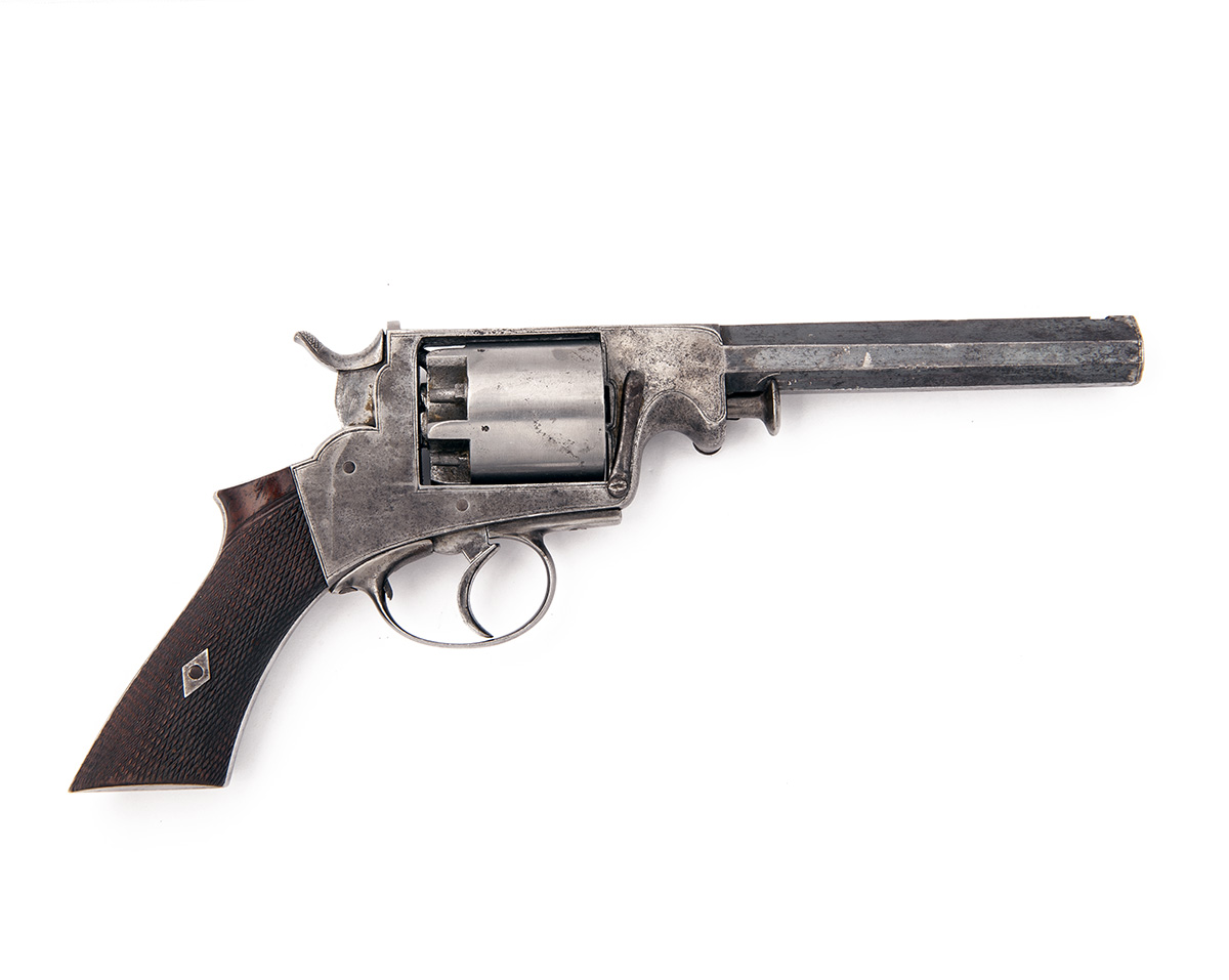 circa 1855, with blued semi-octagonal 6in. barrel, (missing fore-sight), standing notch rear-sight, the borderline engraved top-strap signed 'JAMES BRYCE EDINBURGH', Adams style rammer, borderline engraved solid frame, brushed bright plain five-shot cylinder, spurred hammer, swept semi saw-handled chequered walnut grips with iron grip-straps, traces of finish especially to barrel