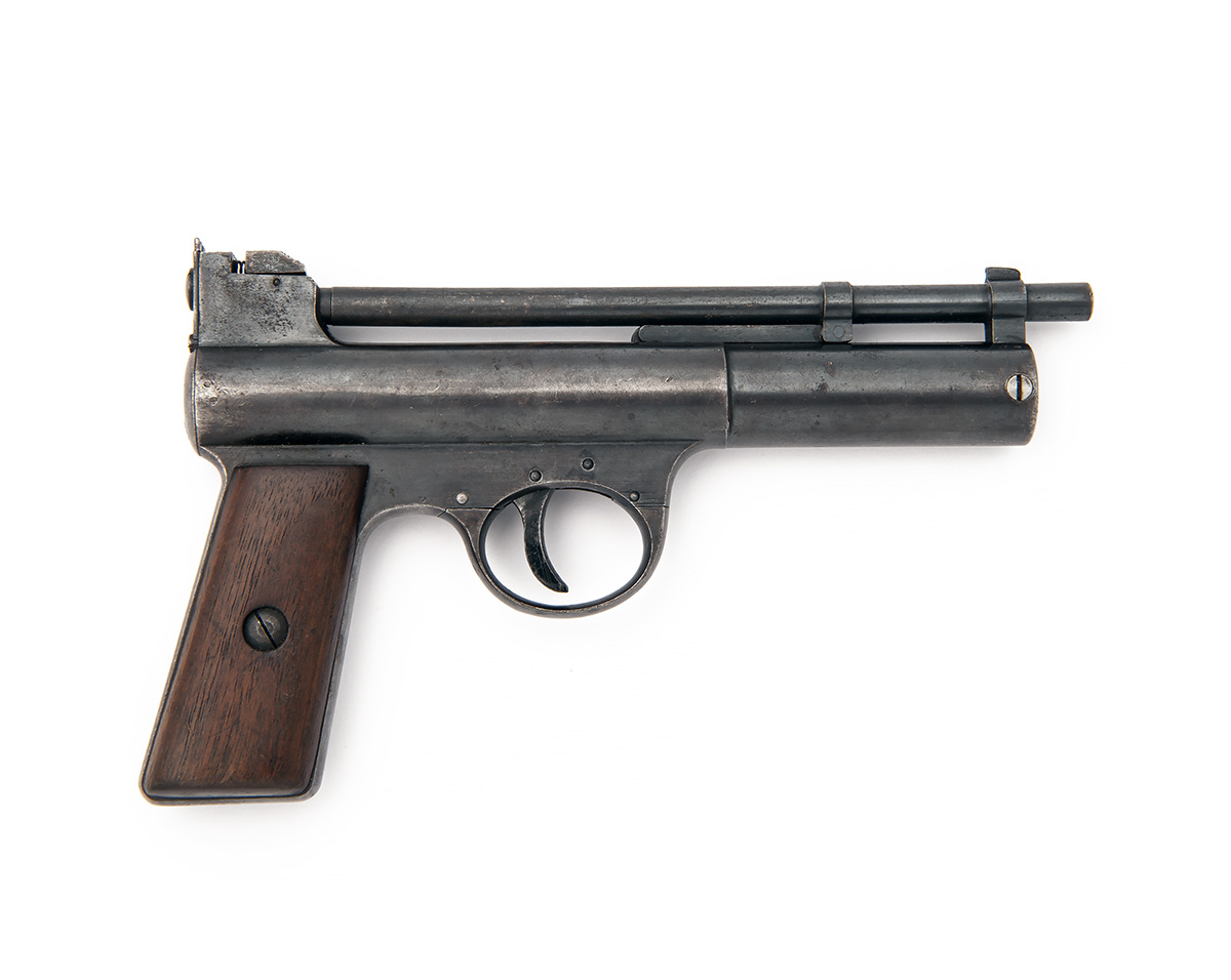 circa 1924-25, with 7 1/8in. blued barrel (hinge screw replaced), sliding barrel release catch, the breech stamped 'BRITISH PATENT No. 219872, FOREIGN PATENTS PENDING', adjustable rear-sight, stepped air-chamber, the left hand side marked 'WEBLEY AIR PISTOL MKI' and 'WEBLEY & SCOTT LTD BIRMINGHAM & LONDON', four-pin trigger group with rotating safe, smooth walnut grips with inlet 'winged bullet' medallion to left hand side, strong amount of faded finish remaining
