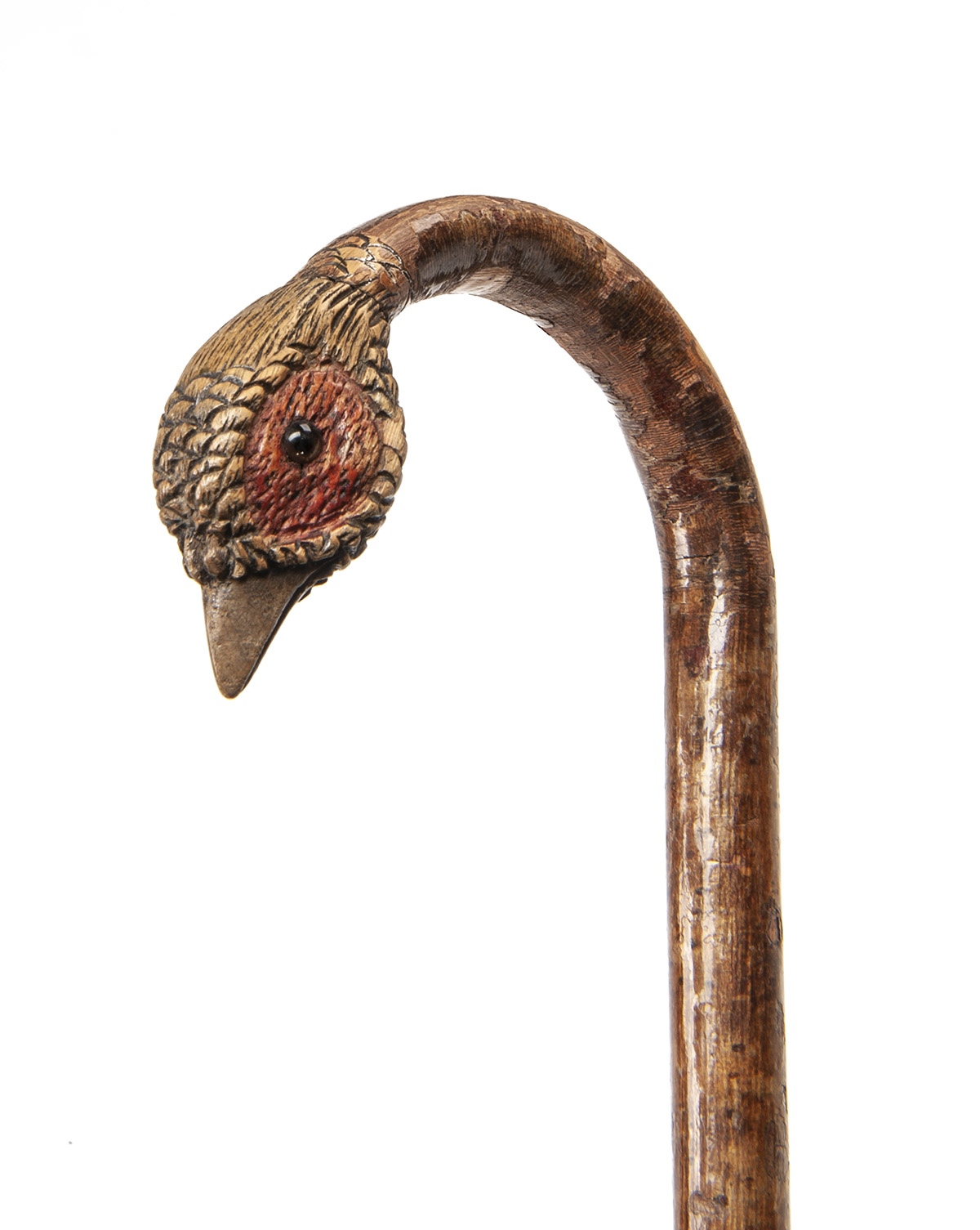 with brown faded cotton canopy measuring approx. 34in., brass tip ferrule, crook handle with carved pheasant head with glass eyes, with silver band marked 'EM BELL, Northend, Durham, with London silver hall marks dated 1912