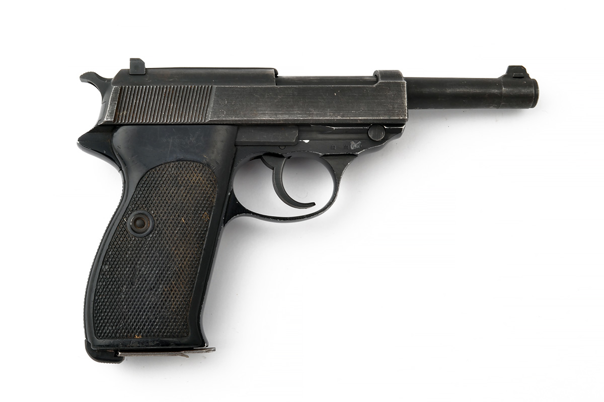 ** A 9mm (PARA) SEMI-AUTOMATIC PISTOL SIGNED WALTHER, MODEL 'P1', serial no. 329670, with 5in. exposed barrel, slide with safety catch, blacked alloy frame and chequered black bakelite grips