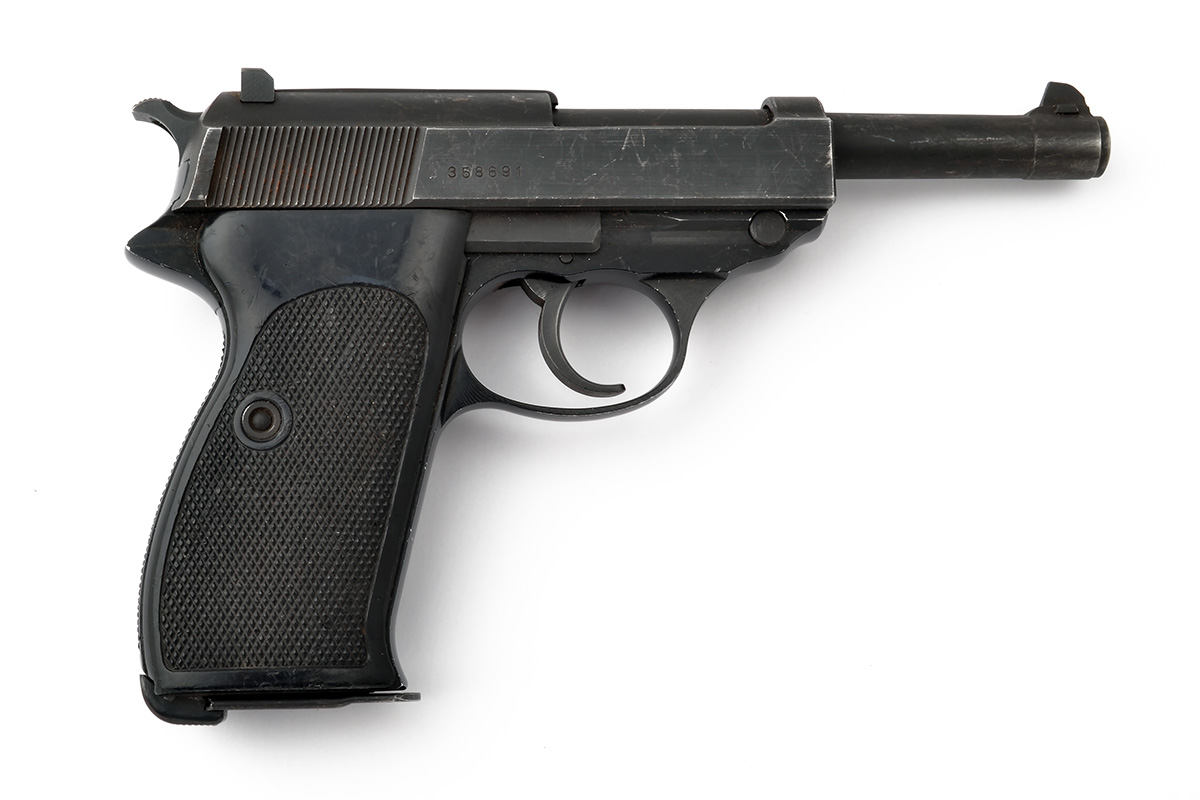 ** A 9mm (PARA) SEMI-AUTOMATIC PISTOL SIGNED WALTHER, MODEL 'P1', serial no. 358691, with 5in. exposed barrel, slide with safety catch, blacked alloy frame and chequered black bakelite grips