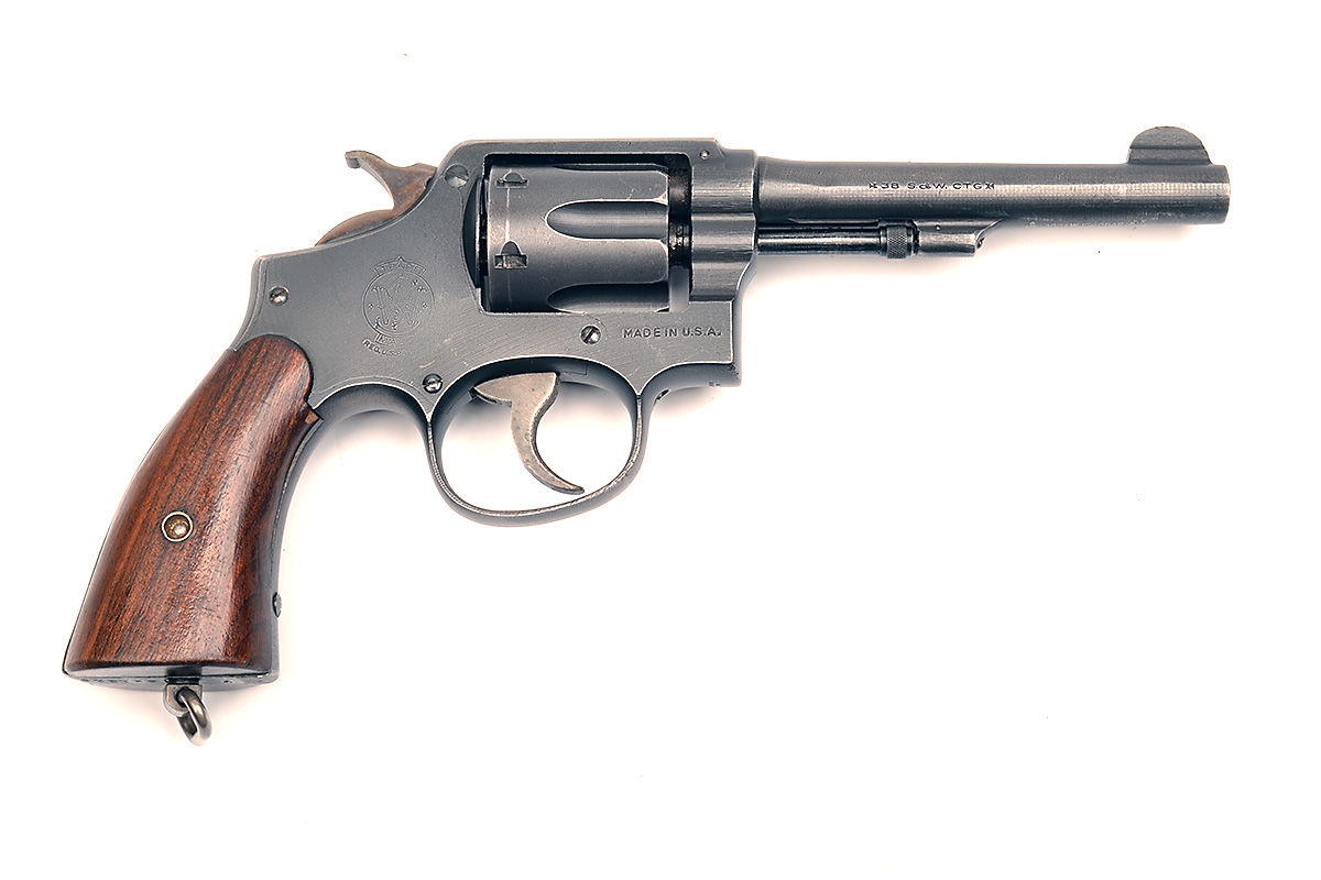 A .38 (S&W) SIX-SHOT SERVICE REVOLVER SIGNED SMITH & WESSON, MODEL 'VICTORY', serial no. V321219, with military finished 5in. barrel, solid frame, swing-out fluted cylinder and smooth wood grips