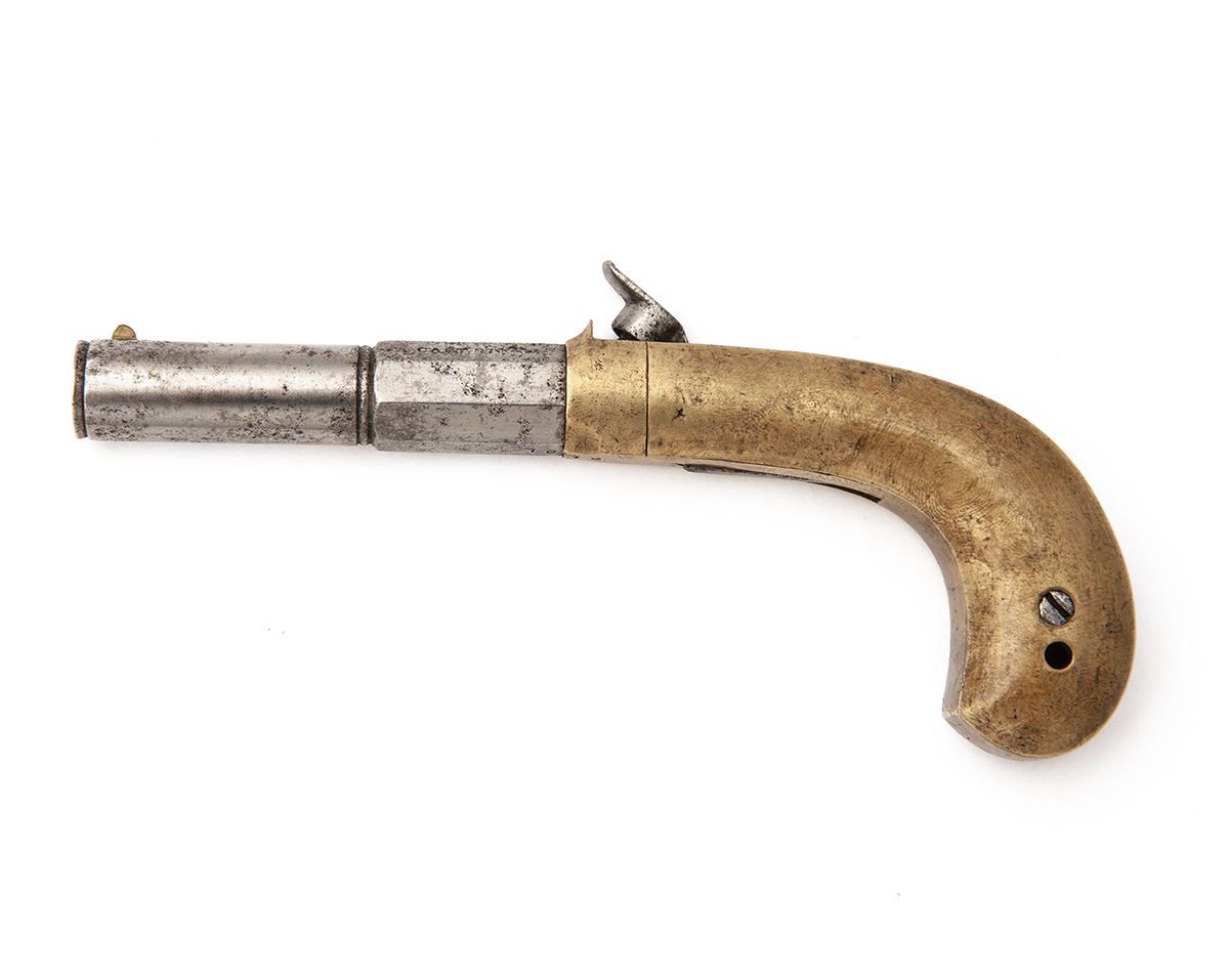 produced between 1838-41, with turn-off two-stage brushed bright 3in. rifled iron barrel, carved bands at the muzzle and intersection, the top-flat at breech signed 'FAIRBANKS BOSTON' (traces only legible), the adjacent left hand flat 'CAST STEEL', plain moulded brass butt with semi birdshead grip pierced through with lanyard aperture, concealed iron trigger and exposed off-set top-hammer