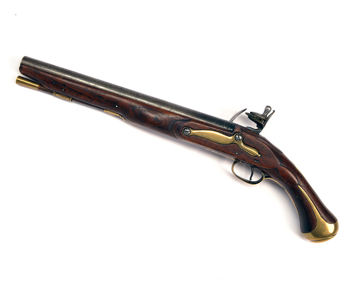 A DECORATIVE INERT FLINTLOCK PISTOL, in imitation of an English military 18th century holster pistol, wood, brass and steel construction, approximately 19 1/2in. overall