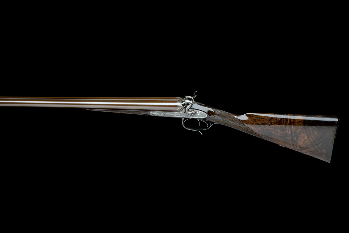 29 3/4in. nitro reproved fine damascus barrels, wide rib engraved 'E.M. REILLY & CO. NEW OXFORD STREET. LONDON.', 2 3/4in. chambers, bored approx. true cyl. and 1/2 choke, push-forward underlever, carved percussion fences, action flats marked 'PATENT ACTION' and 'J.P. PATENT 1037' (likely referring to J. Purdey patent double bite, patent no. 1104 of 2nd May 1863), rounded bar, rebounding sidelocks with engraved faceted hammers, fine acanthus scroll engraving with feathered bordering, 14 1/2in. highly-figured stock (crack to left underhorn and at head to rear of right lockplate) including horn buttplate, weight 7lb. 4oz.