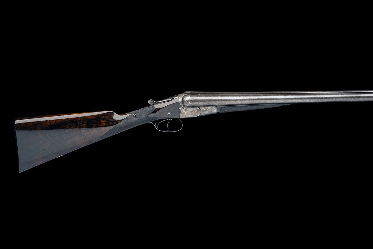 30in. nitro reproved Greener trade marked damascus barrels, the rib engraved 'W.W. GREENER. 68 HAYMARKET LONDON & ST. MARY'S SQUARE. BIRMINGHAM. WINNER AT THE LONDON GUN TRIALS 1875, 1877, 1878 & 1879', and with a crane at the breech end, the tubes with fine acanthus detailing at the breech ends, 2 1/2in. chambers, bored approx. 3/4 and full choke, some internal pitting, scroll-back treble-grip action with arcaded fences and side shoulders, the toplever gold-inlaid with a crown, manual side safety with gold-inlaid 'SAFE' detail, fine acanthus scroll engraving with some ropework bordering, retaining very slight traces of original colour-hardening, 14 1/4in. well-figured stock with ornate chequering borders and inlaid horn drop points, horn buttplate, the fore-end decorated en suite, weight 6lb. 6oz., in its brass-cornered oak and leather case with green velveteen lining, gold-tooled green leather trade label and some accessories, including large Greener oil bottle, with a canvas and leather outer