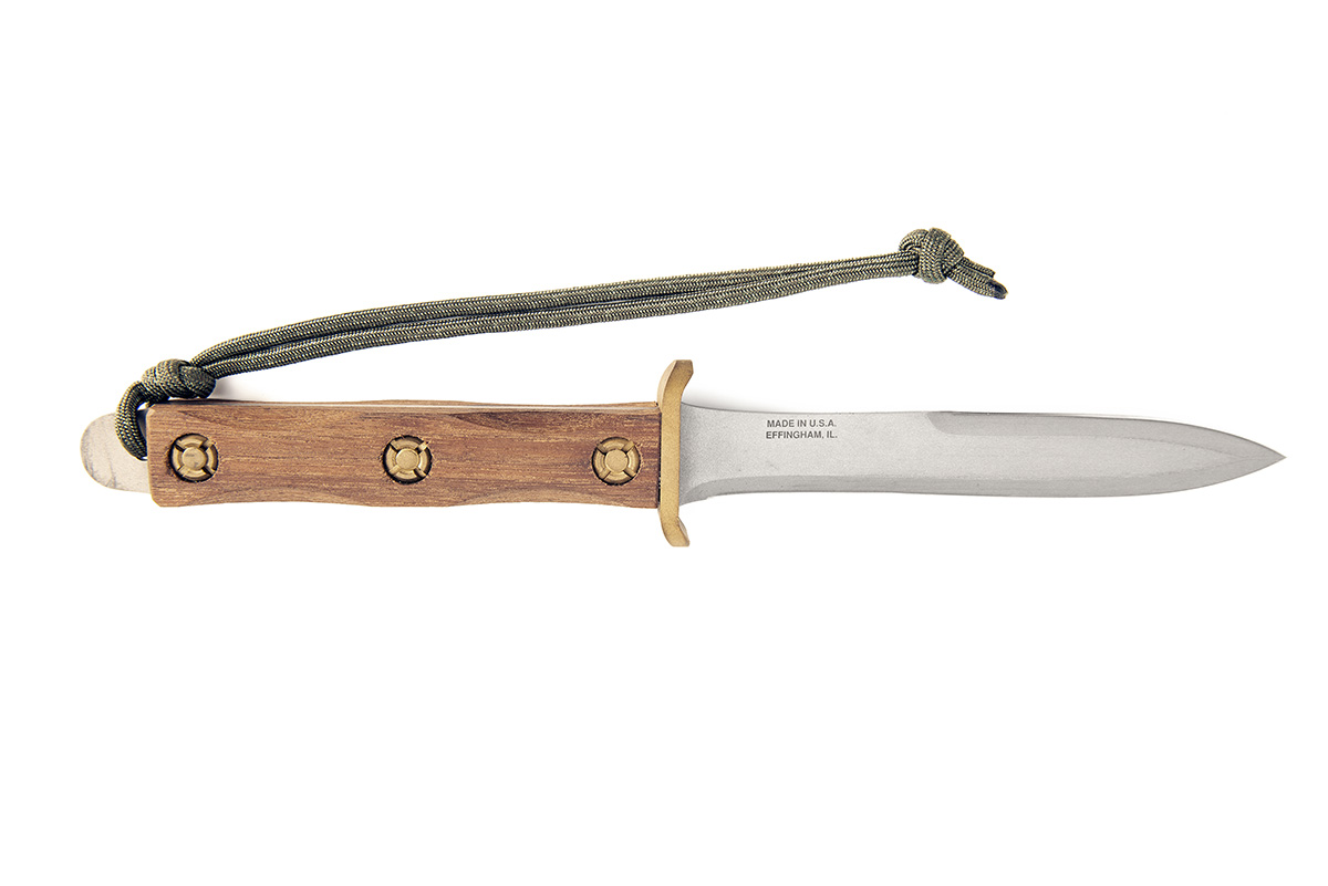 circa 1995, with grey phosphated 6 1/2in. narrow leaf-shaped blade fully edged on one side and half-edged on the reverse, the left hand face etched 'JOHN EK LIMITED EDITION' over 'ONE OF ONE HUNDRED' and with his '1941 Commando' trade-mark at hilt, the reverse with 'MADE IN USA EFFINGHAM IL.', short thick brass cross-guard with turned down tips, squared walnut handle with scalloped edges fixed by three large brass twin slotted screws, the tang extending to form the pommel and drilled for a lanyard (included), complete with its makers card carton, cordura nylon sheath and original bill of sale from 1995