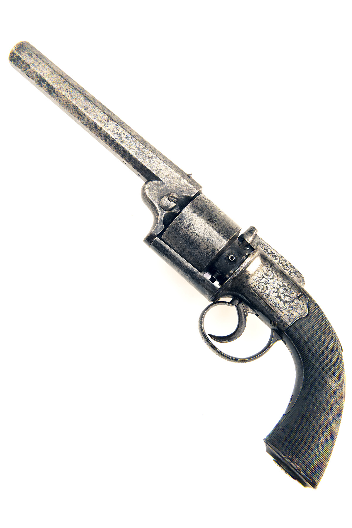 circa 1850, with Birmingham proved octagonal 6 1/4in. barrel, multi-groove rifling, bead fore-sight and engraved band at muzzle, standing notch rear-sight, half-frame and wedge cross-bolt barrel fastener, plain stepped cylinder with scroll engraving over each chamber, radiused scroll engraved iron action with offset engraved central bar-hammer, finely chequered walnut butt, oval escutcheon to wrist, moulded iron butt-cap with central trap-door for caps and guarded trigger