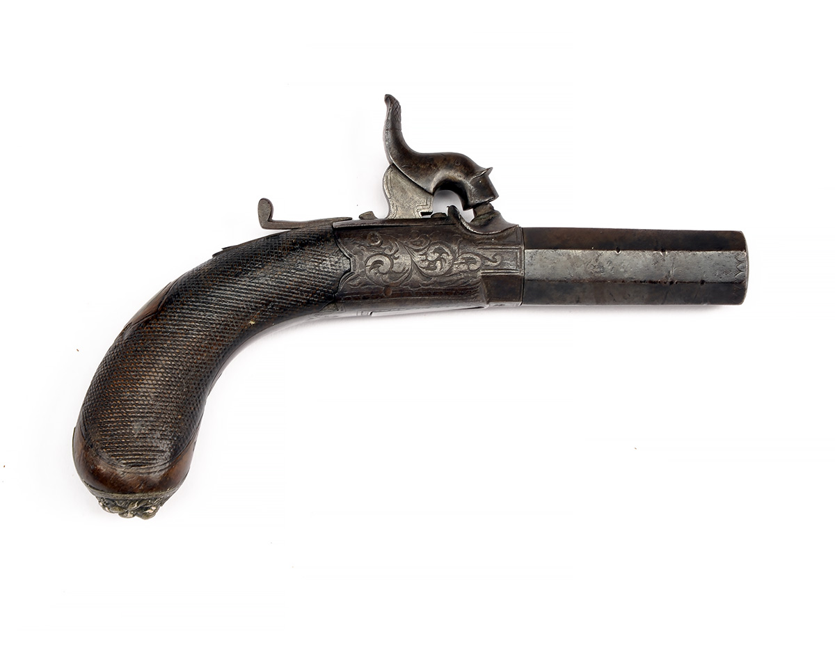 A 40-BORE PERCUSSION POCKET-PISTOL SIGNED WILLIAMS & POWELL, LIVERPOOL, no visible serial number, circa 1840, with turn-off 2in. octagonal barrel, radiused and engraved central hammer action with concealed automatic trigger and chequered walnut bag-shaped butt with lion mask butt-cap