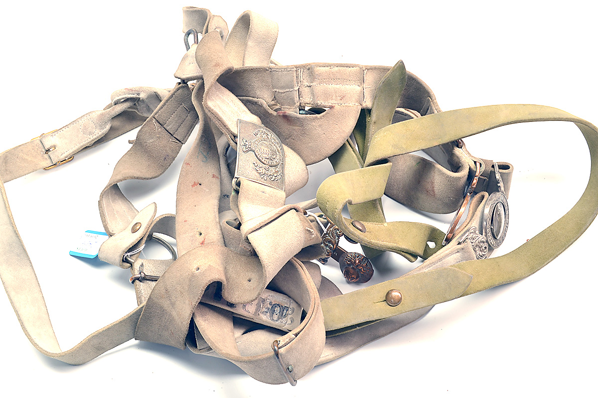 THREE BRITISH SLADE WALLACE VICTORIAN/EDWARDIAN WAIST & SWORD-BELTS AND BUCKLES including 'LONDON RIFLE VOLUNTEERS' in white metal (central device absent from clasp), 'GRENADIER GUARDS' with white metal facing to clasp and the last possibly London Rifles with Hobson makers stamp to reverse (3)