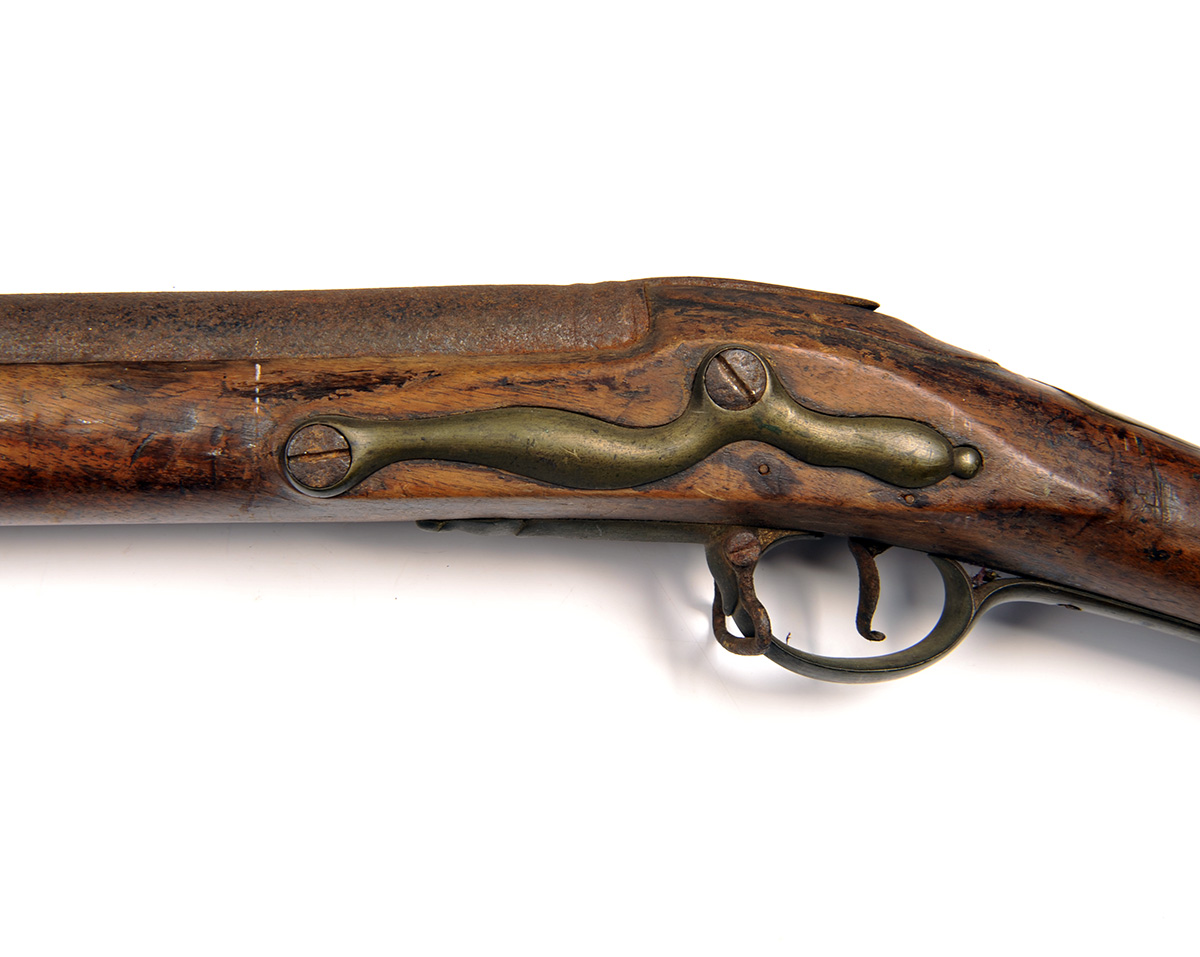 A RELIC .750 FLINTLOCK ENGLISH BROWN BESS MUSKET FOR RENOVATION, with 42in. barrel, missing both cock and frizzen from lock, losses and repairs to the handrail three-quarter stock, brass furniture and missing ramrod,