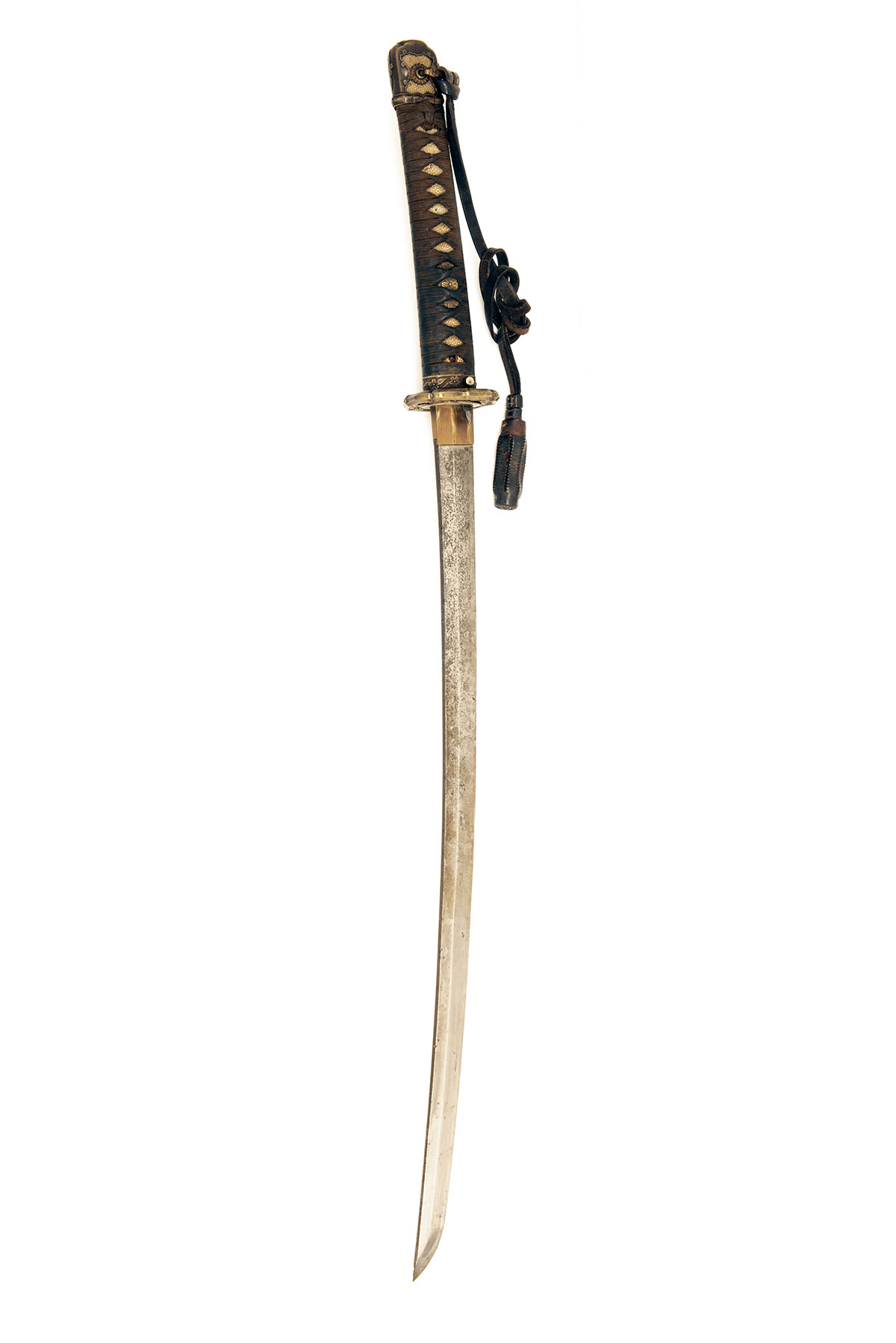 with signed smith-made arsenal 25in. blade (some staining and speckling), straight visible 'hamon', copper 'habaki', solid carved brass military 'tsuba' and mounts with scabbard lock, cotton bound rayskin hilt, complete with its leather covered metal service scabbard and leather sword-knot