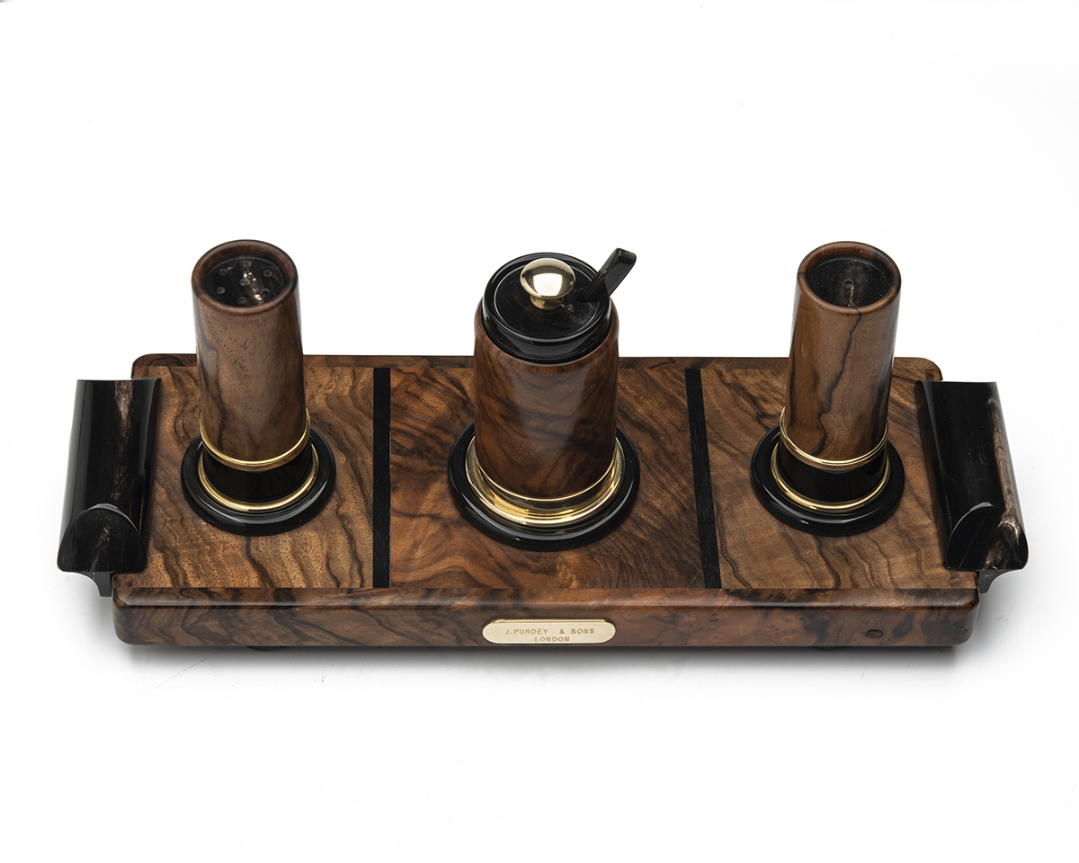 comprising of salt and pepper shakers in the form of 4-bore cartridges, a mustard pot, presented on a walnut tray with two ebony handles and a brass plaque engraved 'James Purdey & Sons, London'