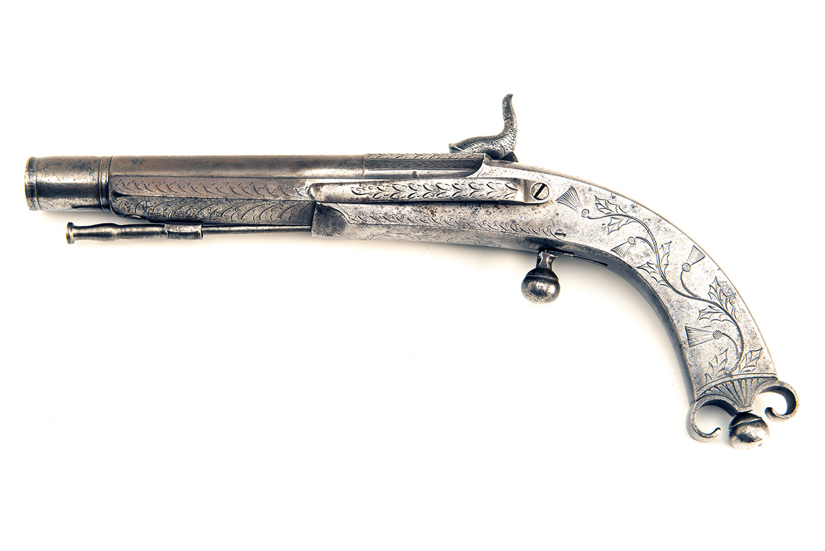 circa 1880, with triple-staged 6in. barrel engraved with scrolls and foliage, the top at breech signed 'LIVERPOOL', borderline and scroll engraved lock signed 'KIND', engraved slab-sided hammer, distinctive Scottish style all steel stock with slab-sided butt engraved with stylised thistles, 'ramshorn' heel with ball-headed pricker stored between the horns, the fore-end engraved with foliage, unguarded ball trigger, belt hook on the left hand side and under-barrel iron ramrod