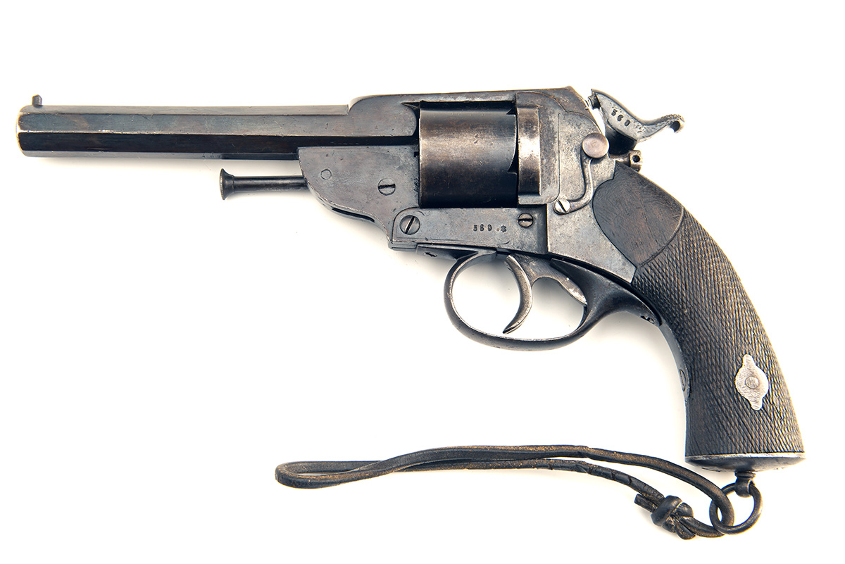 converted from percussion circa 1875, with octagonal 5 3/4in. barrel, under-barrel rammer removed and refitted with a side mounted Belgian style plunge ejector, plain cylinder with rear-ratchet indexing, the frame converted to gate-loading and with mounted firing-pin, curved back-action banana lock with off-set side-hammer and chequered walnut grip with lanyard ring at heel, in a British military leather holster