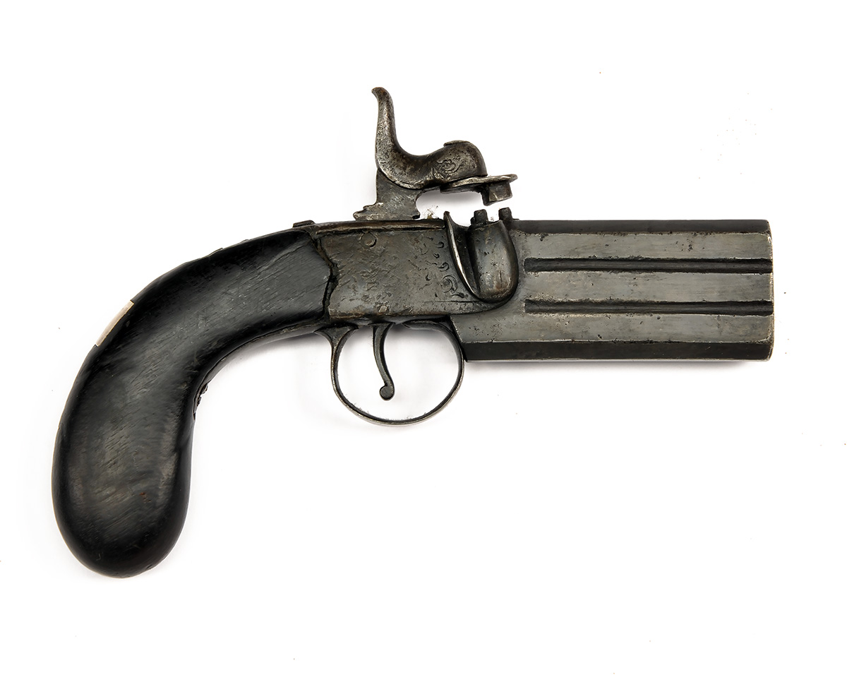 A RARE 80-BORE PERCUSSION TRIPLE-BARRELLED OVER-UNDER PISTOL WITH SELECTIVE HAMMER, UNSIGNED, no visible serial number,