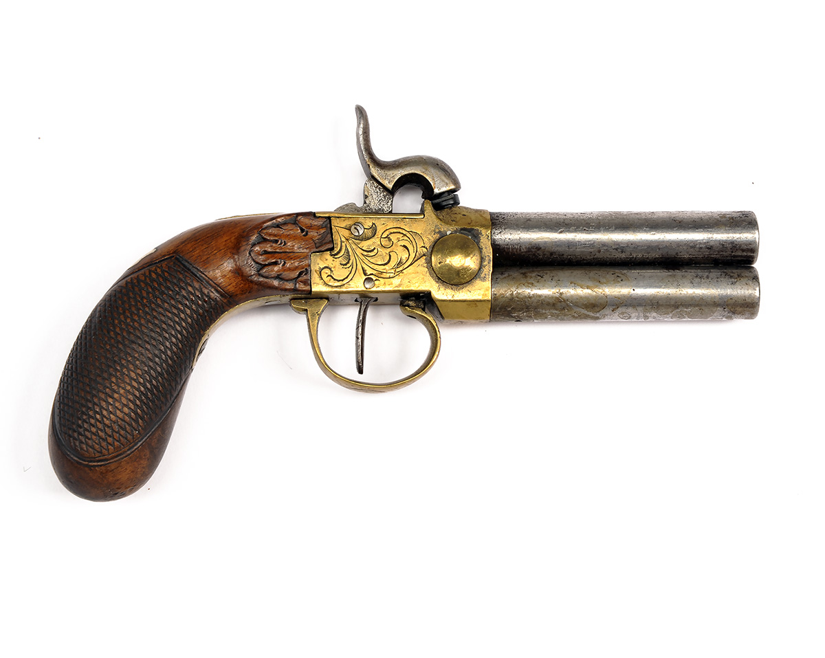 A 60-BORE PERCUSSION OVER-UNDER POCKET-PISTOL, UNSIGNED, no visible serial number, Belgian, originally a tap-action now modified to discharge both barrels simultaneously, with round iron 2 3/4in. turn off barrels false rifled at the muzzles (one frozen), engraved brass action with central hammer and guarded trigger, chequered walnut butt